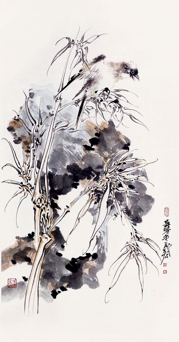 我在花鸟画的创作中努力寻找学术与民间欣赏之间的结合点。比如生肖系列作品所描绘的动物就是还原其生命的本来面目。《金秋》这一作品所表现的题材就是农家在秋收时常见的农作物,有一个农民看了作品就欣喜地说:“您的作品所表现的东西,我们家都有,而且其中一个玉米还是粘玉米。”